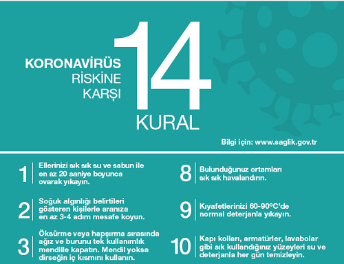 Bakanlığın hazırladığı koronavirüs Riskine Karşı 14 Kural Afişi (50x70) sitemize eklenmiştir. Orjinal boyut için dosyayı indirebilirsiniz..