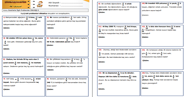 4.Sınıf Matematik Kesirlerle İlgili Problemler Etkinliği 6