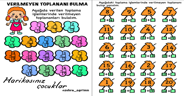 1.Sınıf Matematik Verilmeyen Toplananı Bulma Çalışma Sayfaları Etkinliği