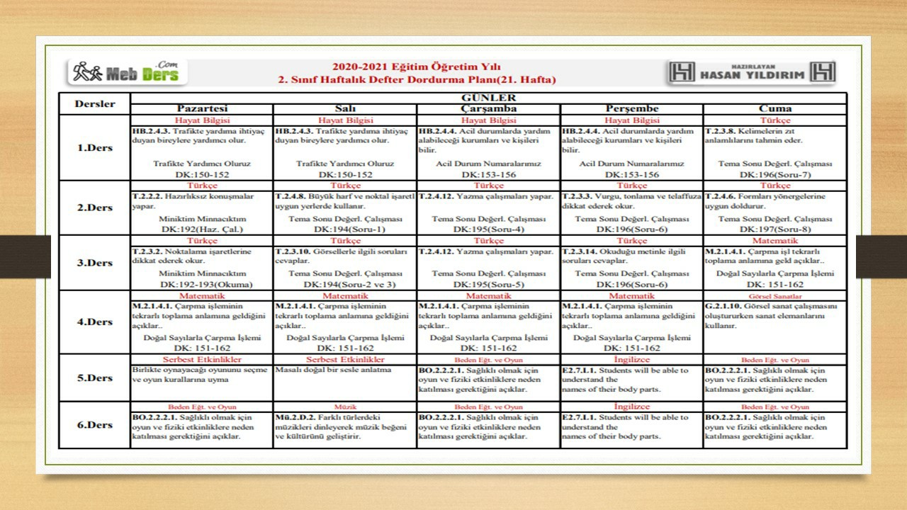 2.Sınıf 21.Hafta(08-12 Mart) Defter Dolum Planı