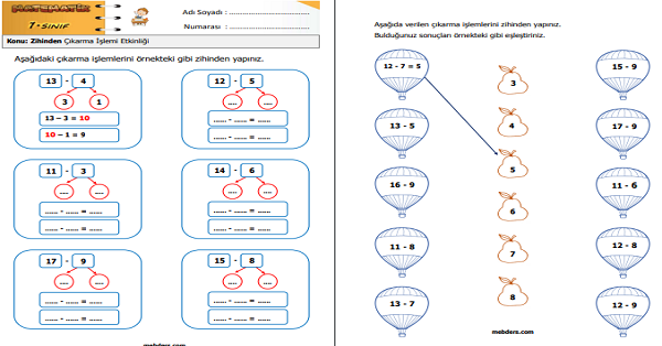 1.Sınıf Matematik Zihinden Çıkarma İşlemi Etkinliği 2