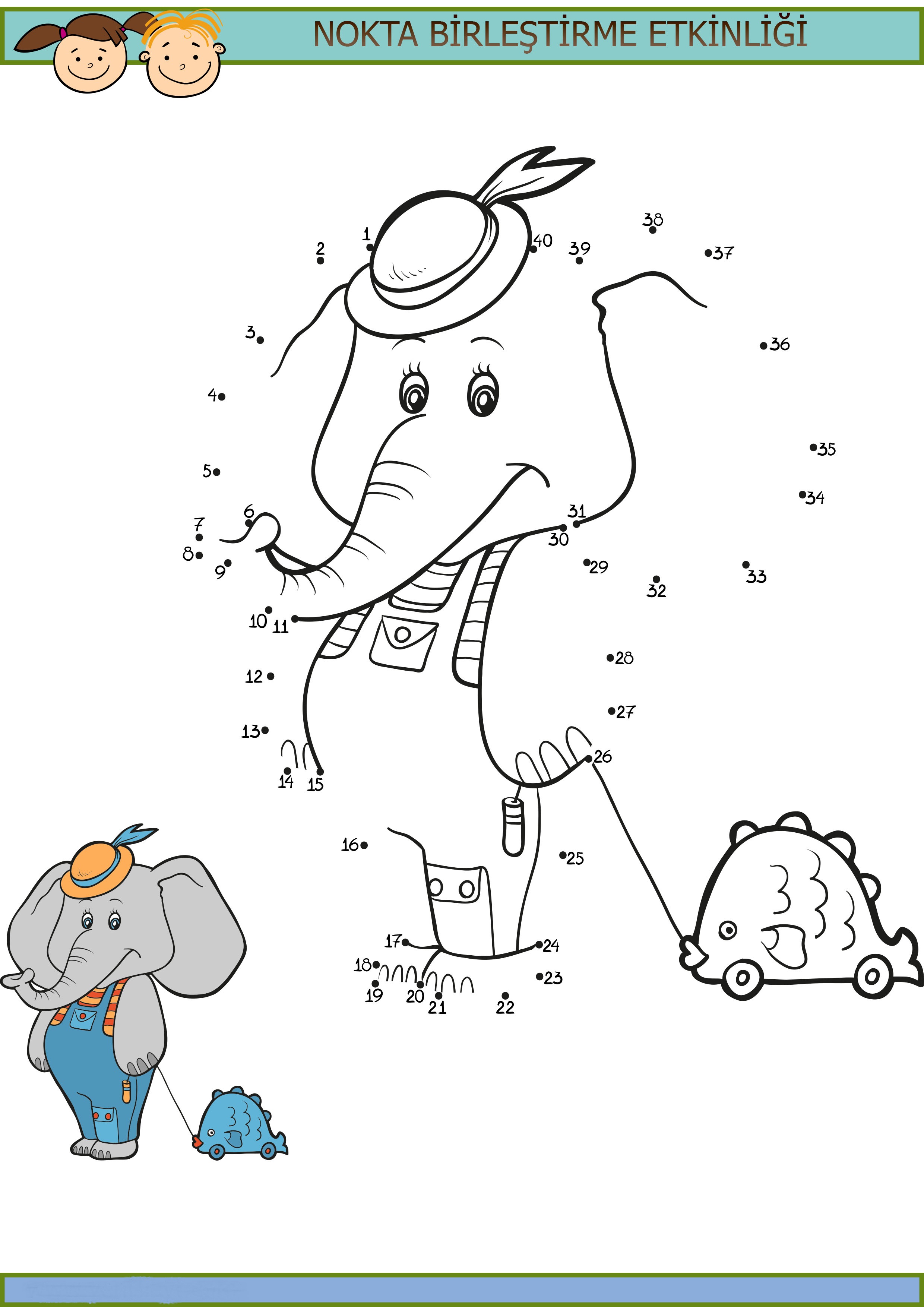 Oyuncak balığıyla oynayan fil nokta birleştirme etkinliğidir. Orjinal boyut için dosyayı indiriniz.