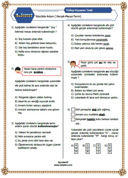 4. Sınıf Türkçe Sözcükte Anlam Kazanım Testi