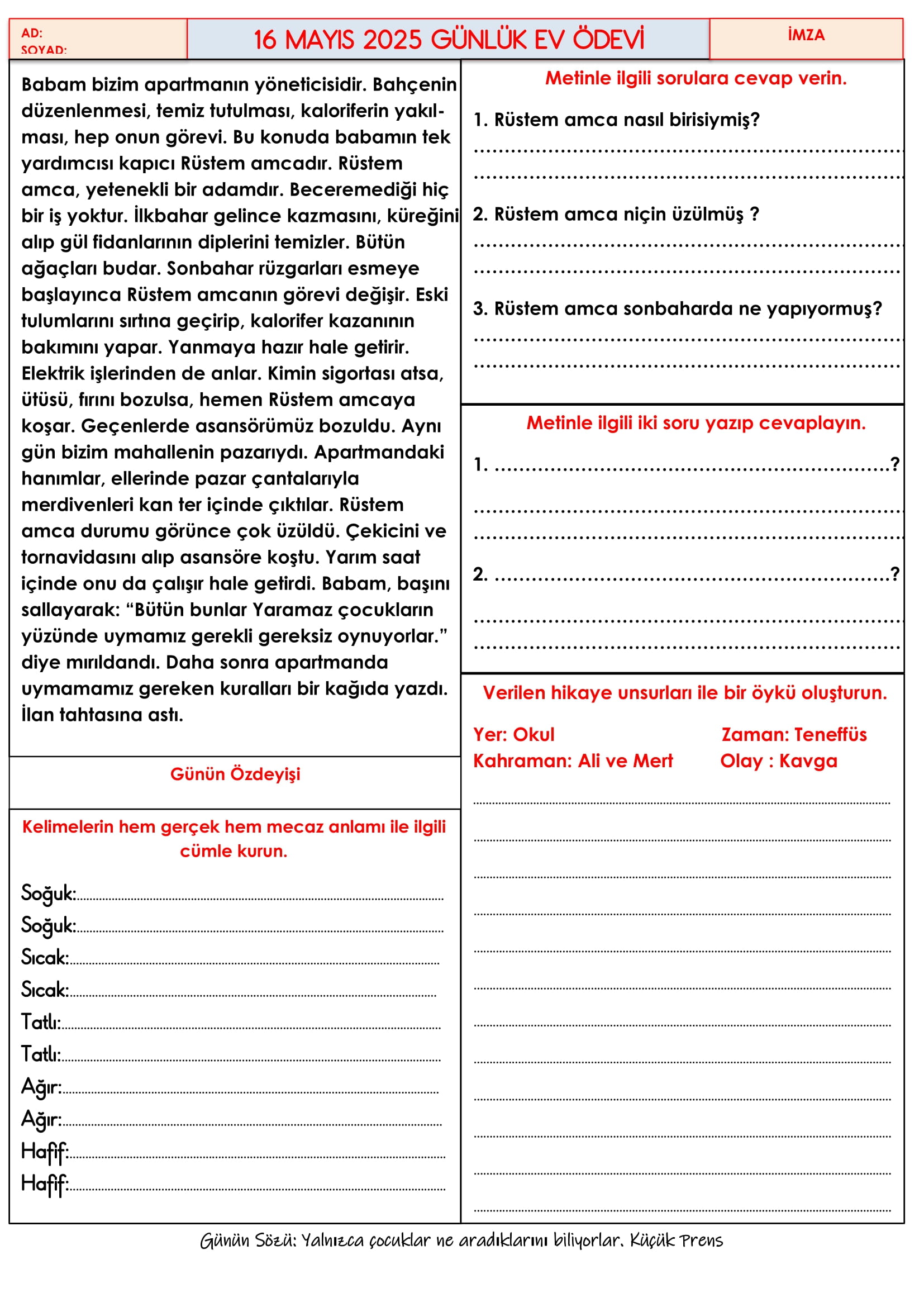 3.Sınıf - 16 Aralık 2025 Günlük Ev Ödevleri