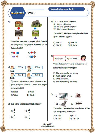 4. Sınıf Matematik Tartma Kazanım Testi 1 ETKİLEŞİMLİ