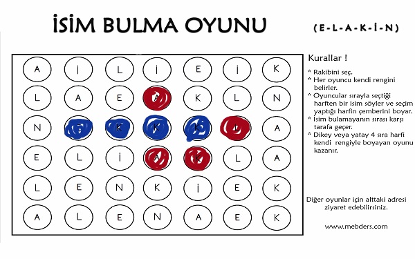 1.Grup Harflerle İsim Bulma Oyunudur. Karşılıklı 2 kişiyle oynanır. Her oyuncu sırayla seçtiği harfle bir isim söyler ve harfin çemberini kendi rengiyle boyar. Yatay veya dikey olarak sıralı bir şekilde 4 çember boyayan oyunu kazanır.