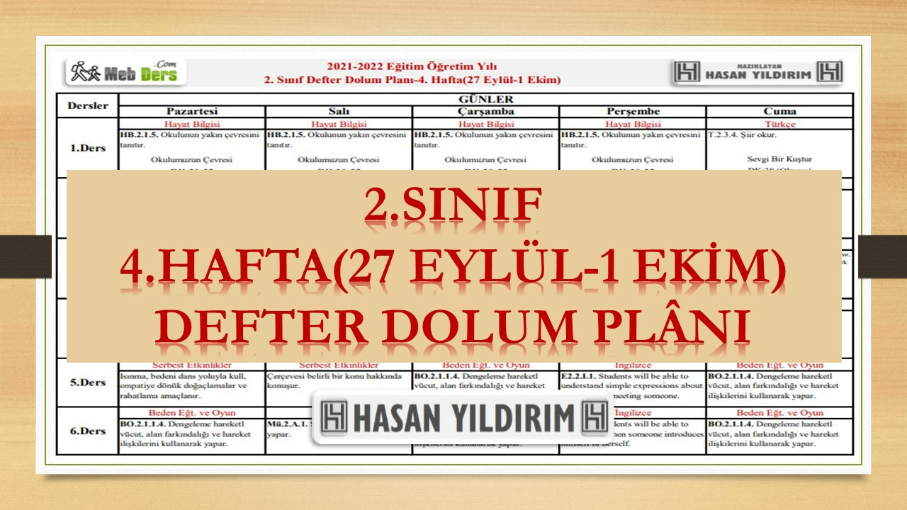 2.Sınıf 4.Hafta(27 Eylül-1 Ekim) Defter Dolum Planı