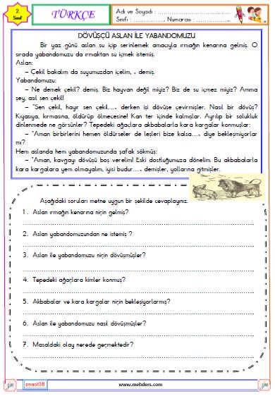 2. Sınıf Türkçe Okuma ve Anlama Etkinliği (Dövüşçü Aslan ile Yabandomuzu)