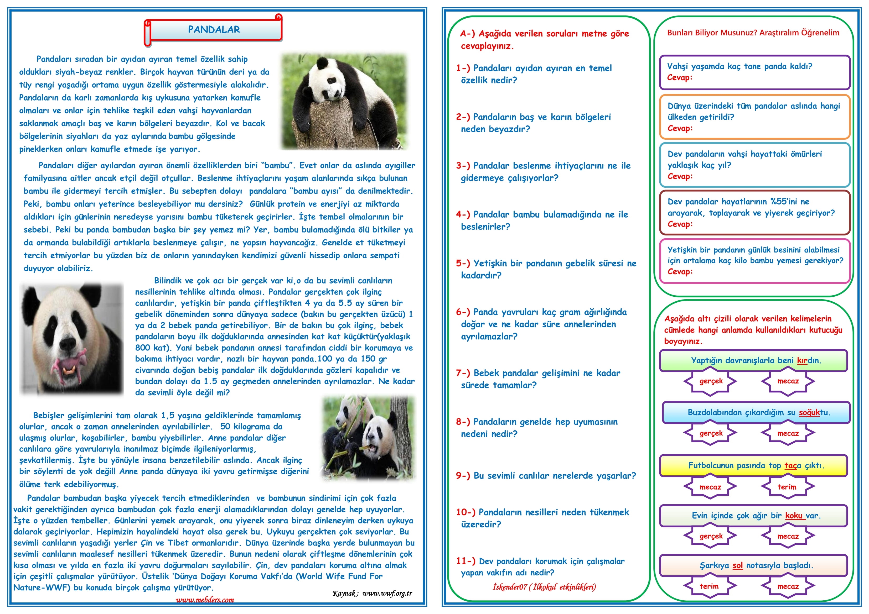 4.Sınıf Türkçe Pandalar Okuma Anlama ve Metin Çalışması 3