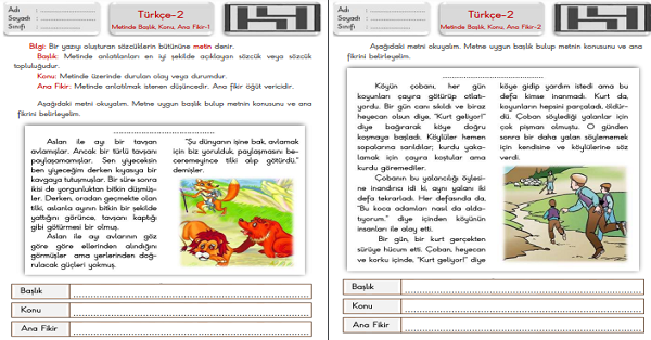 2.Sınıf Türkçe Metinde Başlık, Konu, Ana Fikir Çalışma Sayfaları