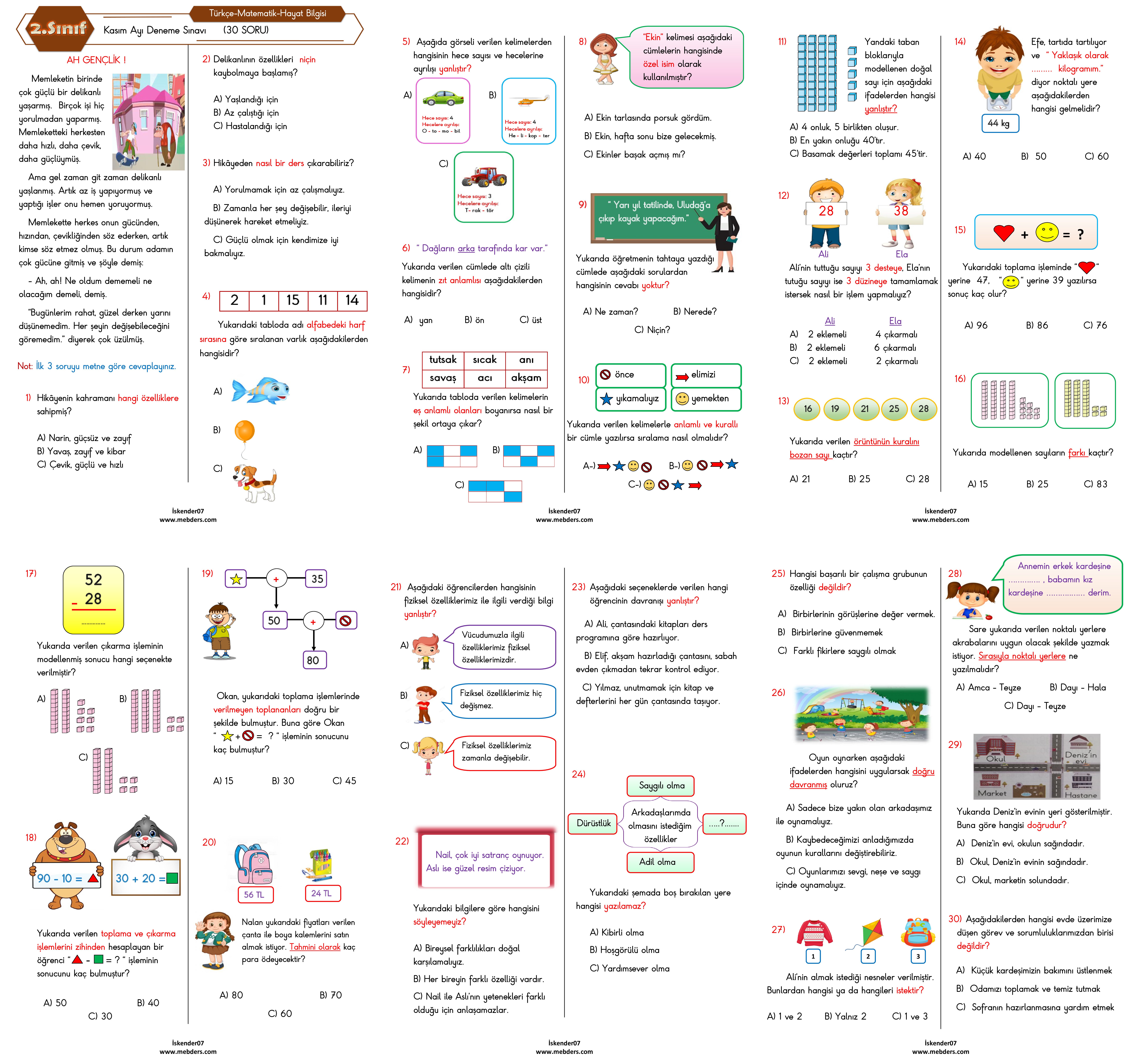 2.Sınıf Kasım Ayı Deneme Sınavı (Türkçe-Matematik-Hayat Bilgisi 30 Soru)