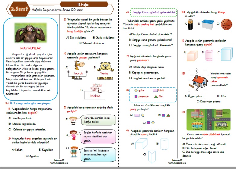 2.Sınıf Haftalık Değerlendirme Testi - 18.Hafta (10-14 Ocak)
