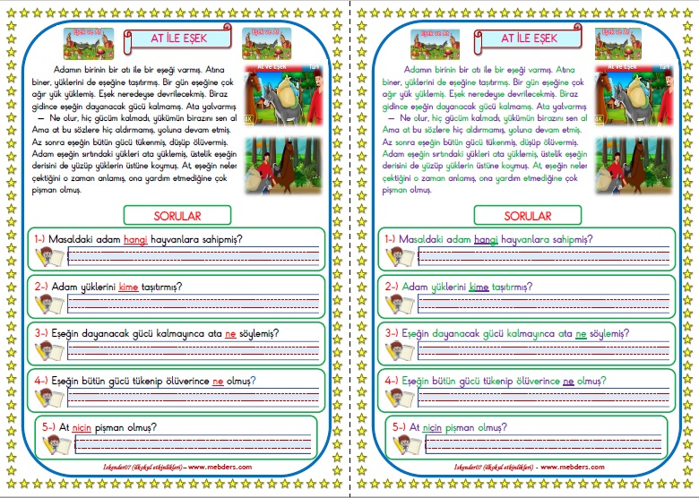 1.Sınıf Türkçe At ile Eşek Okuma Anlama Metin Çalışması 13
