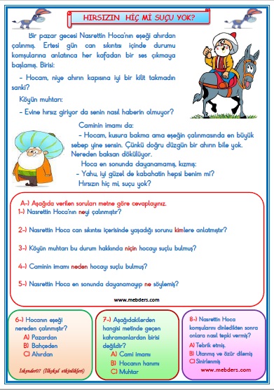 1.Sınıf Türkçe Hırsızın Hiç Mi Suçu Yok Okuma Anlama Metin Çalışması 34