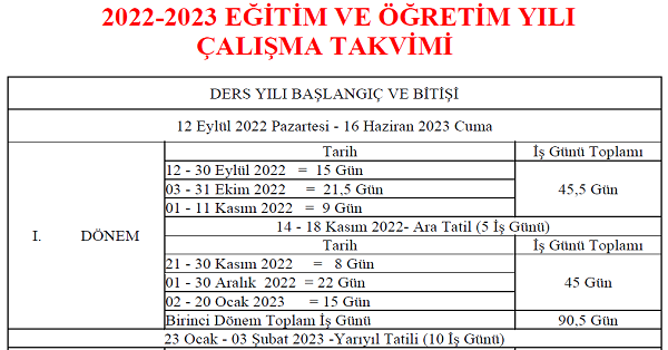 2022-2023 Eğitim ve Öğretim Yılı Çalışma Takvimi