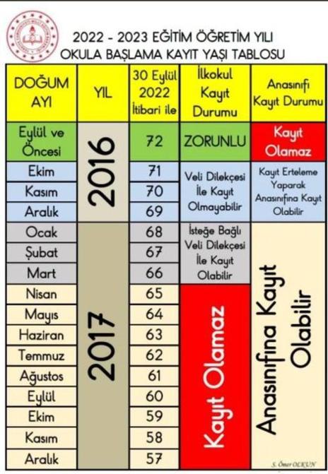 2022-2023 Eğitim Öğretim Yılı Kayıt Yaşı Tablosu