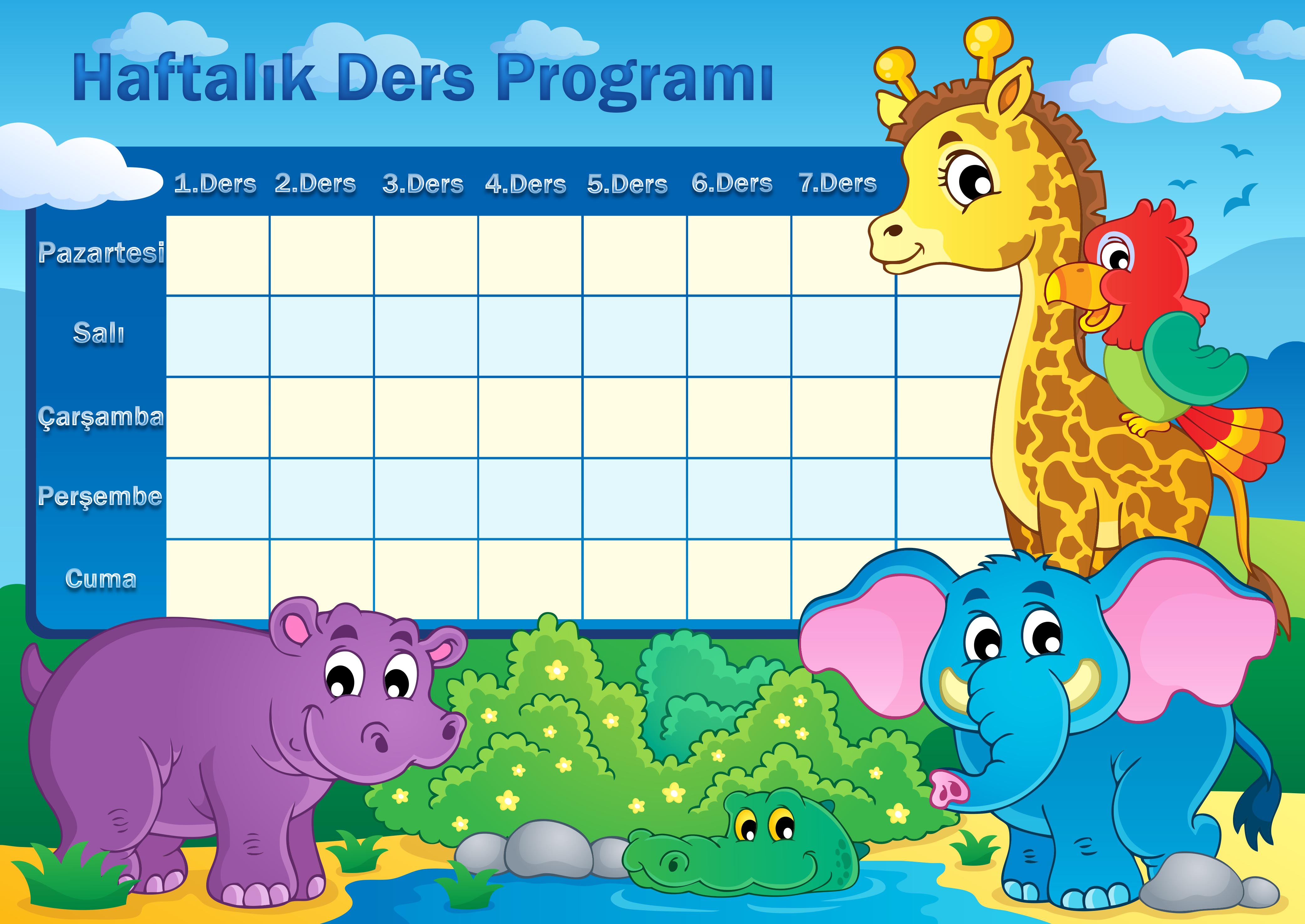 Sevimli hayvanlarla süslenmiş haftalık ders programı şablonudur. Orjinal boyut için dosyayı indirebilirsiniz.