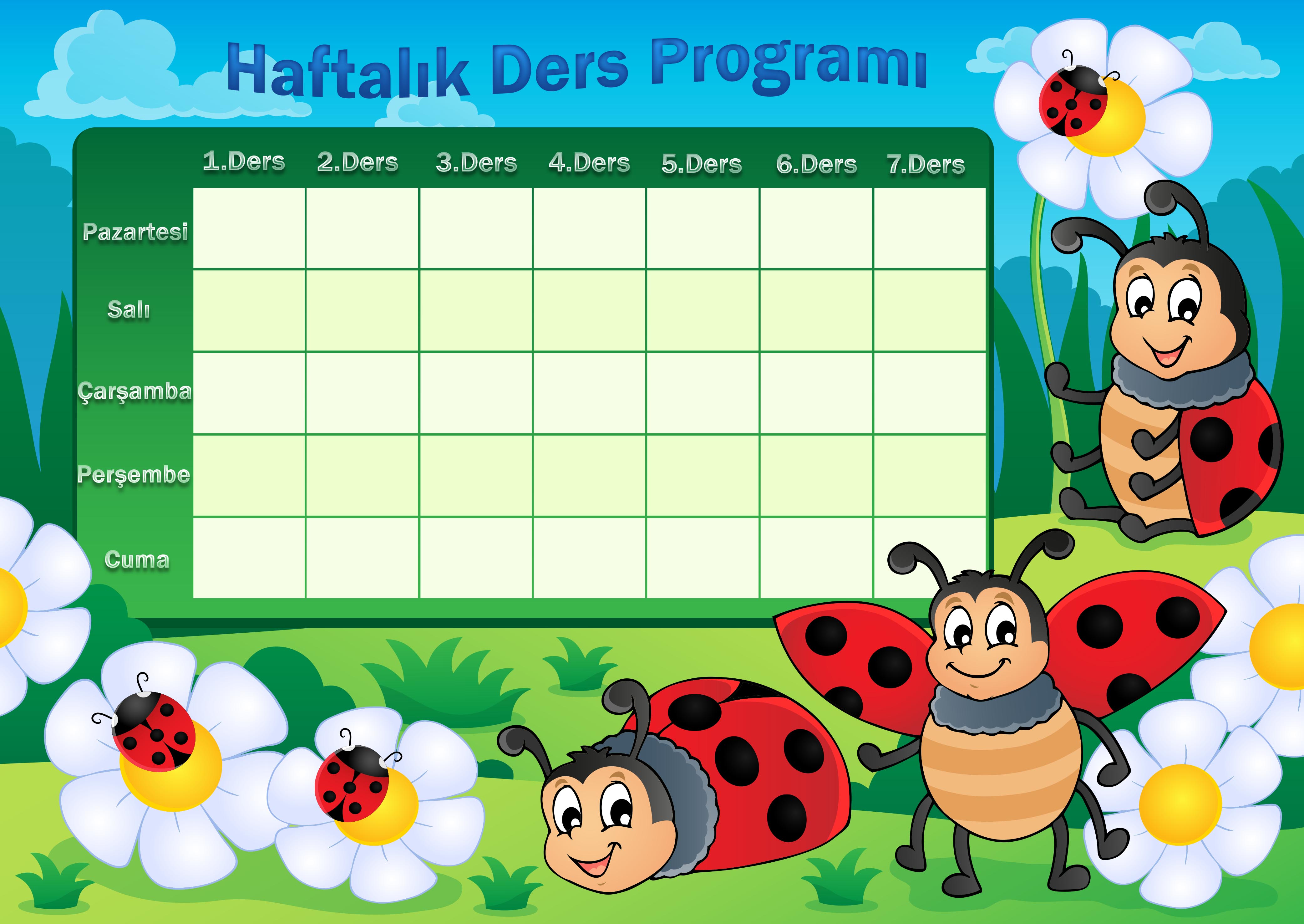 Uğurböcekli haftalık ders programı şablonudur. Orjinal boyut için dosyayı indirebilirsiniz.