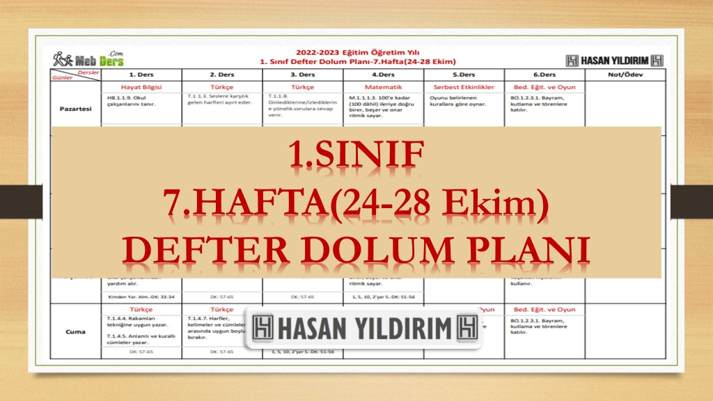 2022-2023 Eğitim Öğretim Yılı 1. Sınıf 7. Hafta (24-28 Ekim) Defter Dolum Planı
