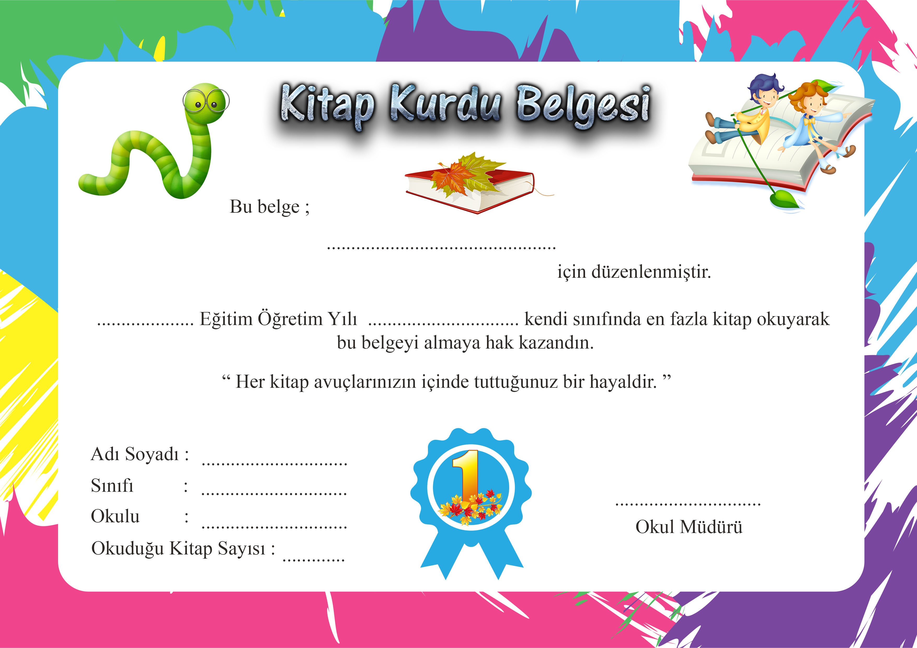 Kitap kurdu belgesidir. A4 resim olarak hazırlanmıştır. Basit bir resim düzenleme programında gerekli bilgileri girebilirsiniz. Orjinal boyut için dosyayı indirebilirsiniz.