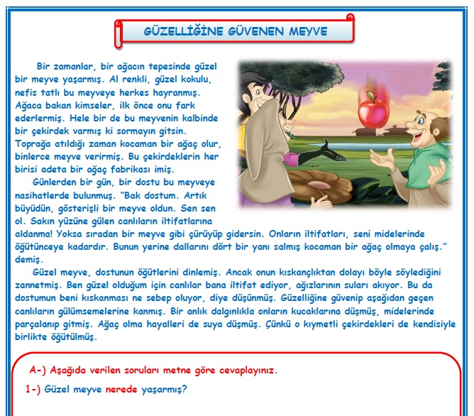 2.Sınıf Türkçe Güzelliğine Güvenen Meyve Okuma Anlama Metin Çalışması