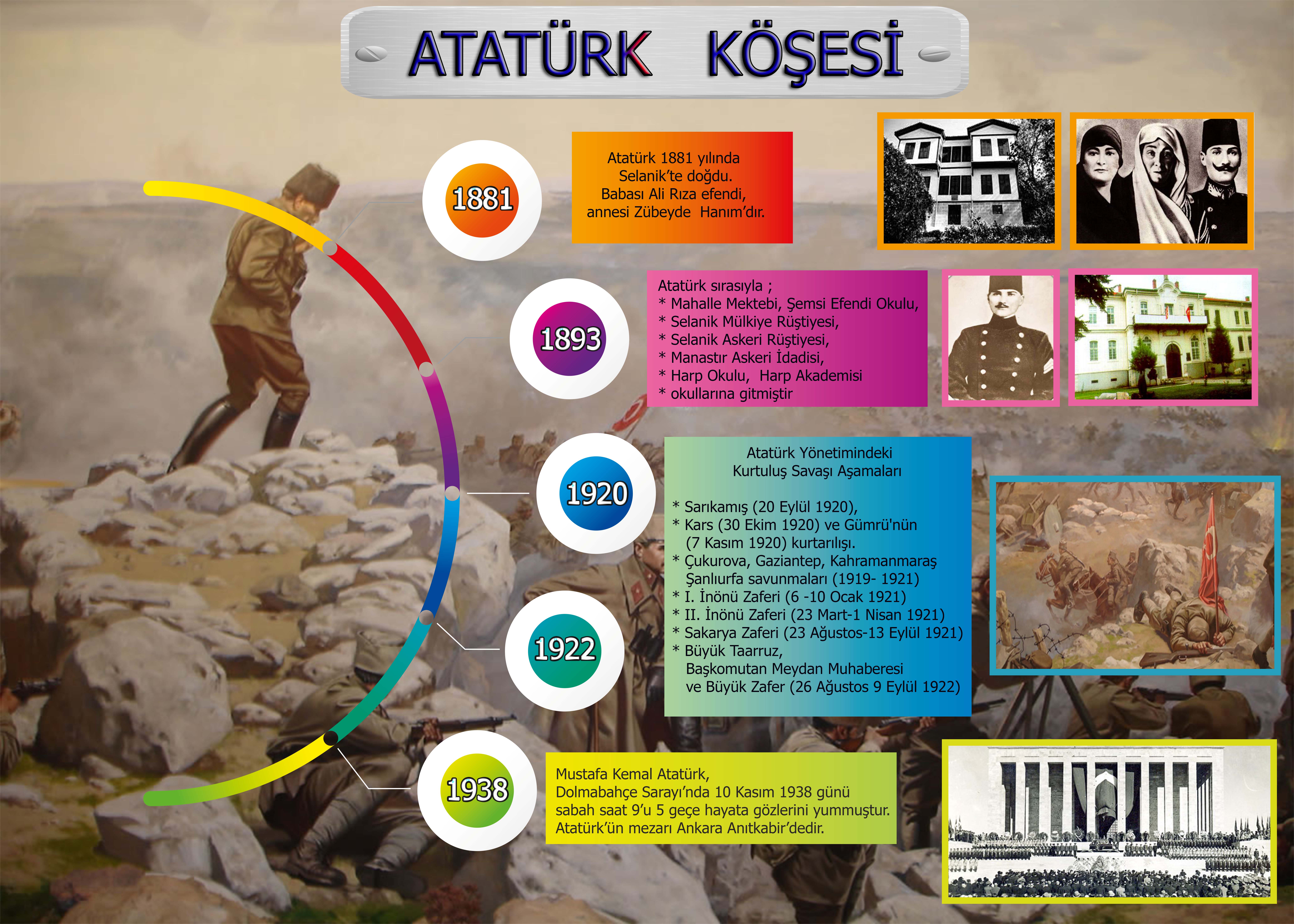 70x50 cm Kurtuluş Savaşı Temalı Atatürk Köşesi Afişidir. Atatürk'ün gittiği okullar, yaptığı savaşlar gösterilmiştir..