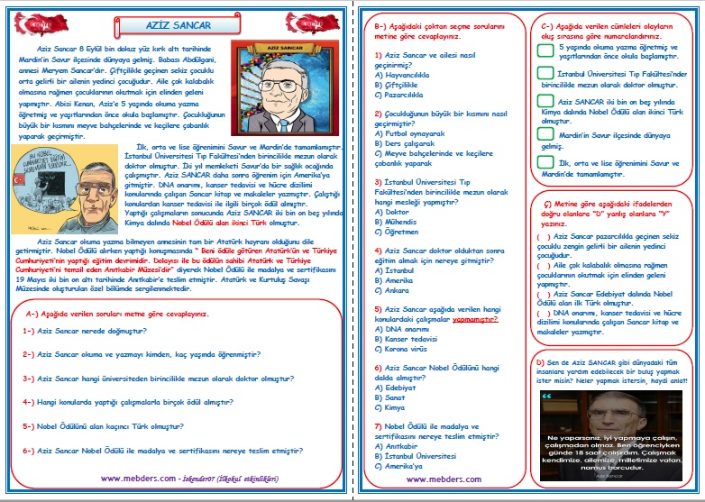 2.Sınıf Türkçe Aziz Sancar Okuma Anlama Metin Çalışması