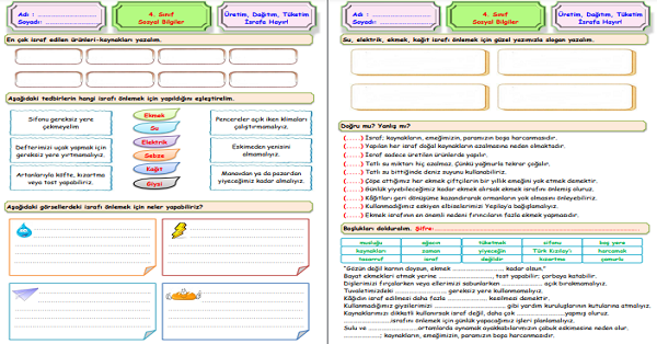 4.Sınıf Sosyal Bilgiler Tüketime Evet, İsrafa Hayır Etkinliği