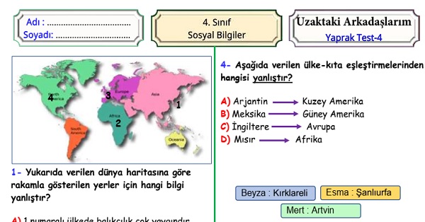 4.Sınıf Sosyal Bilgiler Uzaktaki Arkadaşlarım Yaprak Test 4
