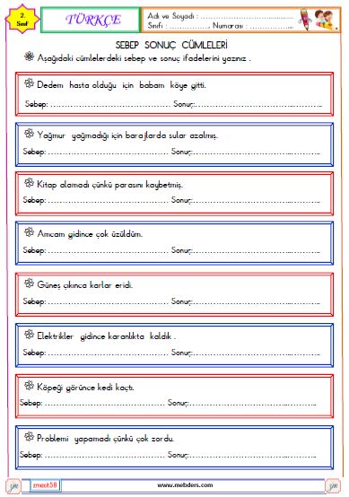 2. Sınıf Türkçe Sebep Sonuç Cümleleri Etkinliği