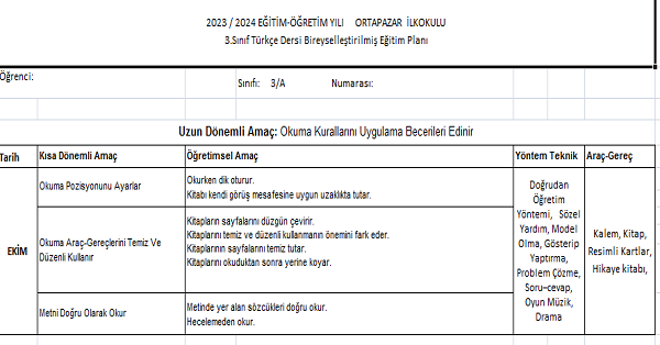 3. Sınıf Türkçe Bireyselleştirilmiş Eğitim Planı (Bep) 2023-2024