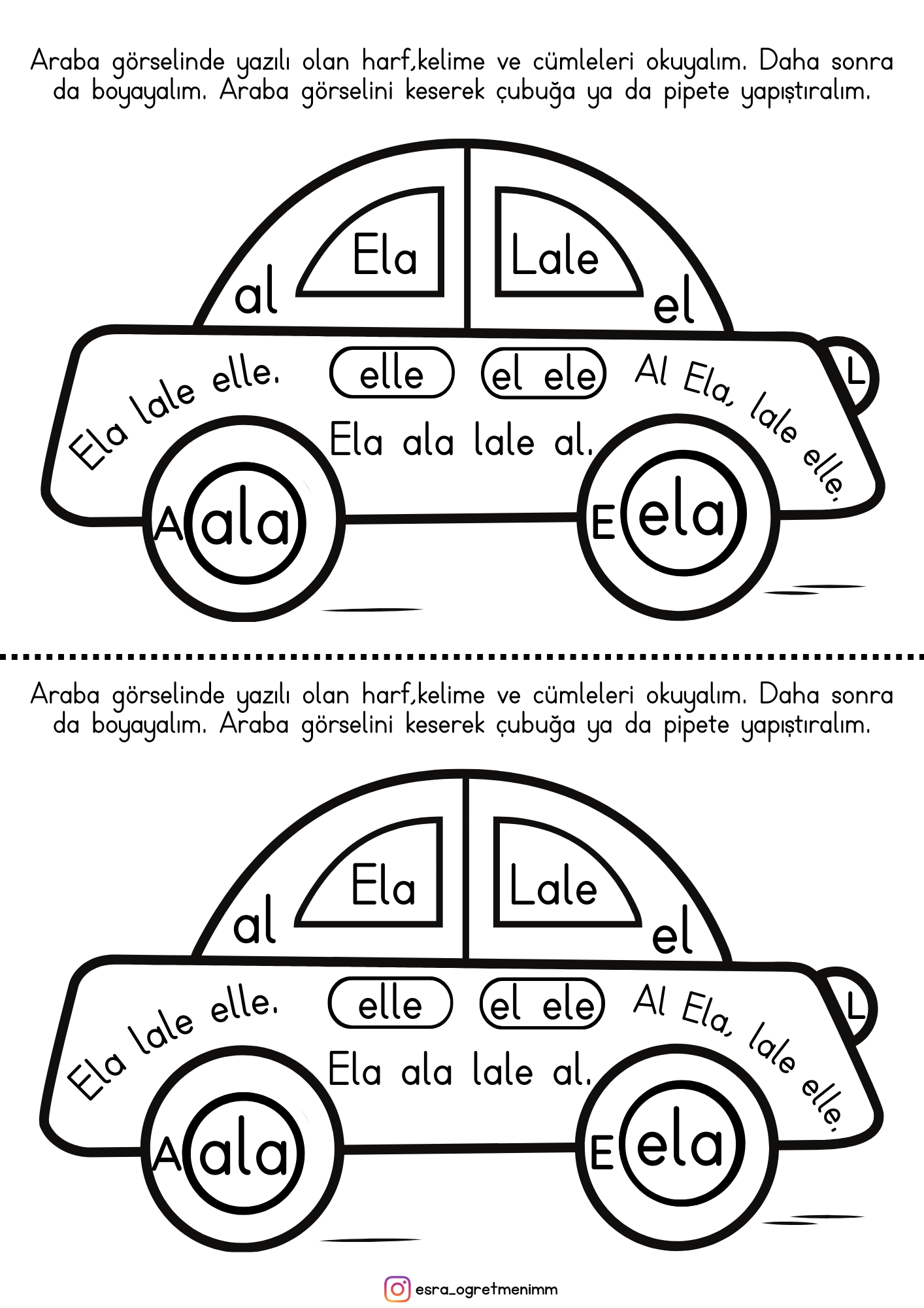 1.Sınıf İlk Okuma Yazma (A-a Sesi) Araba Görselli Okuma Kartı-Oku-Kes-Çubuğa