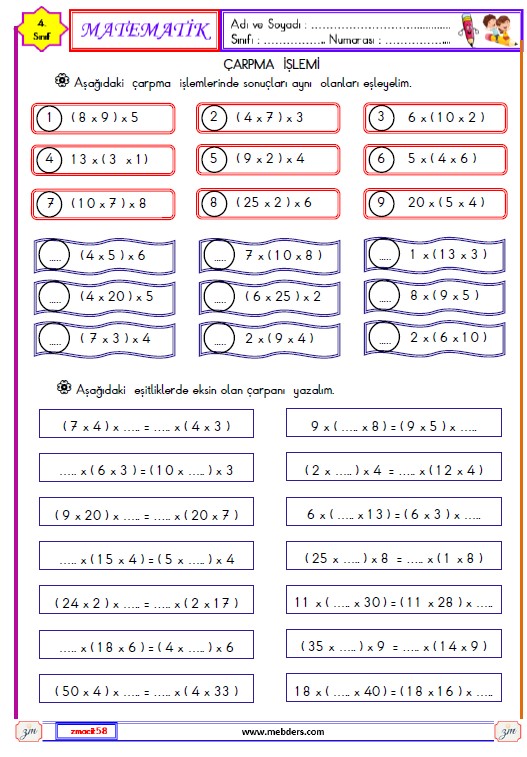 4. Sınıf Matematik Çarpma İşlemi Etkinliği 3