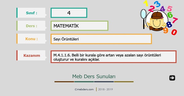 4.Sınıf Matematik Sayı Örüntüleri Sunusudur. 2018-2019 yılı güncel ders kitabına uygun olarak hazırlandı. Zipli dosya içeriğinde powerpoint sunusu mevcuttur. Sınıfınızda sadece akıllı tahta var ve powerpoint sunuyu açamıyorsanız ya da sorunlu açıyorsanız dosya içinde bulunan not defterindeki talimatları uygulayınız.