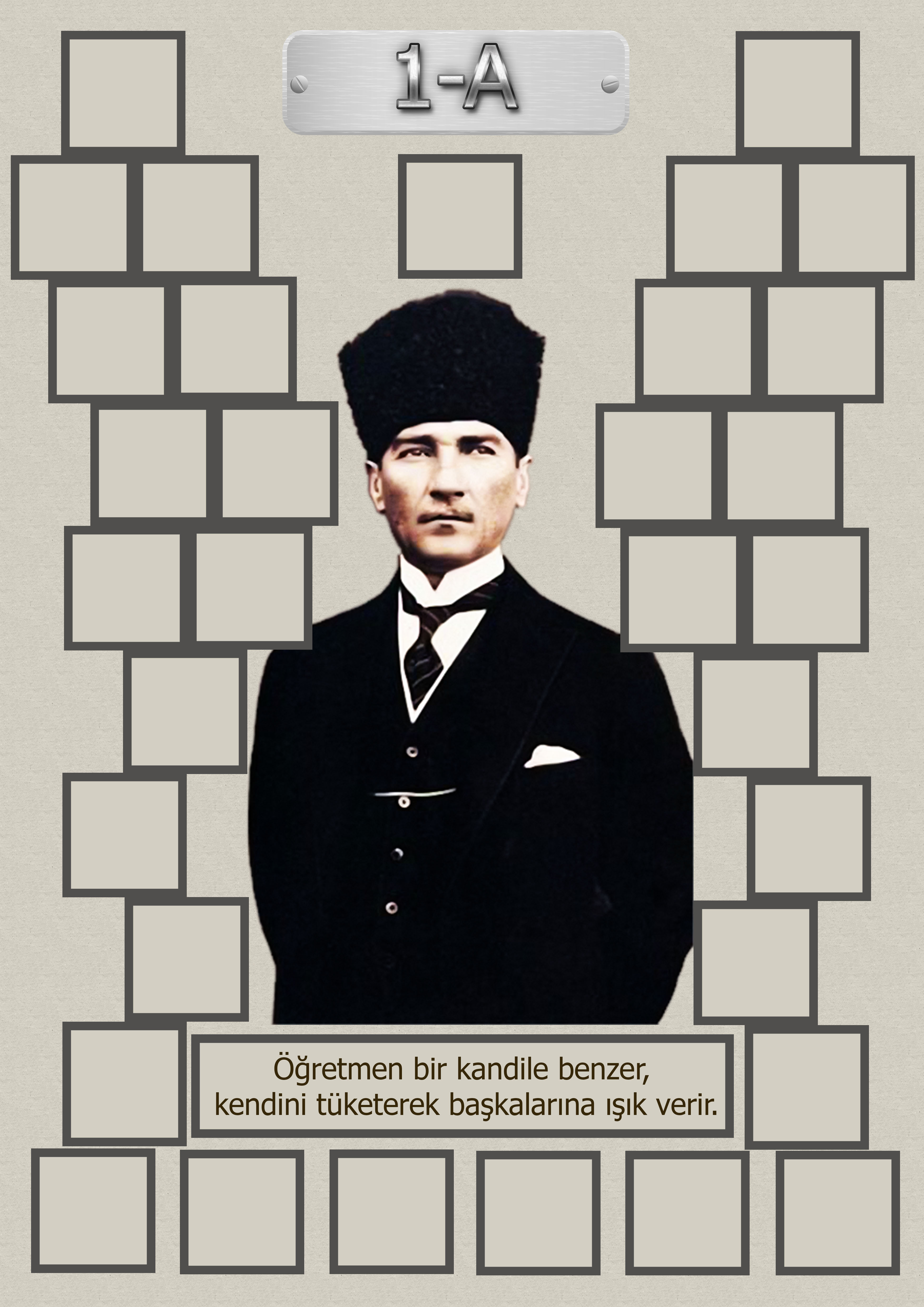 Model 15, 1A şubesi için Atatürk temalı, fotoğraf eklemeli kapı süslemesi - 33 öğrenciliktir. A3 boyutundaki yüksek çözünürlük afiş için dosyayı indiriniz. Kendi öğrenci sayınıza uygun bu model kapı süsü sitemizde yoksa ayrıca istek yapabilirsiniz.