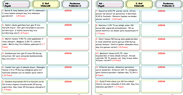 3.Sınıf Matematik Paralarımızla İlgili Problemler-2
