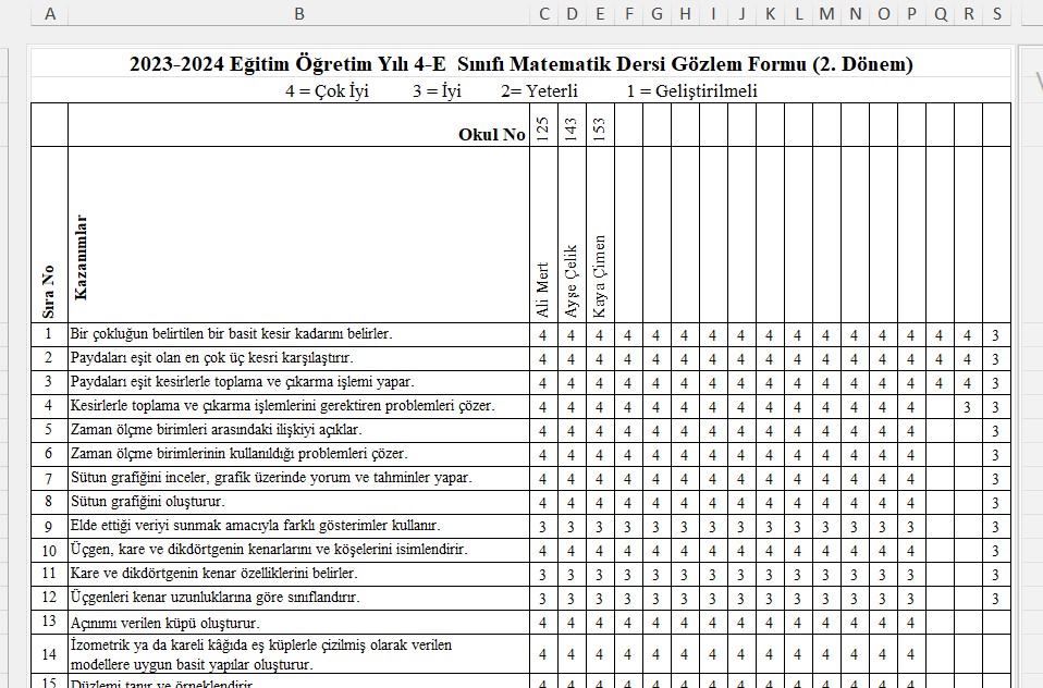 4. Sınıf 2. Dönem Kazanım Değerlendirme Ölçeği (Tüm Dersler - Excel)
