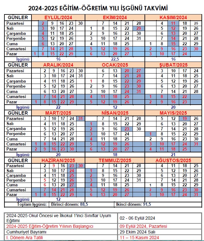 2024-2025 Eğitim Öğretim Yılı Çalışma Takvimi