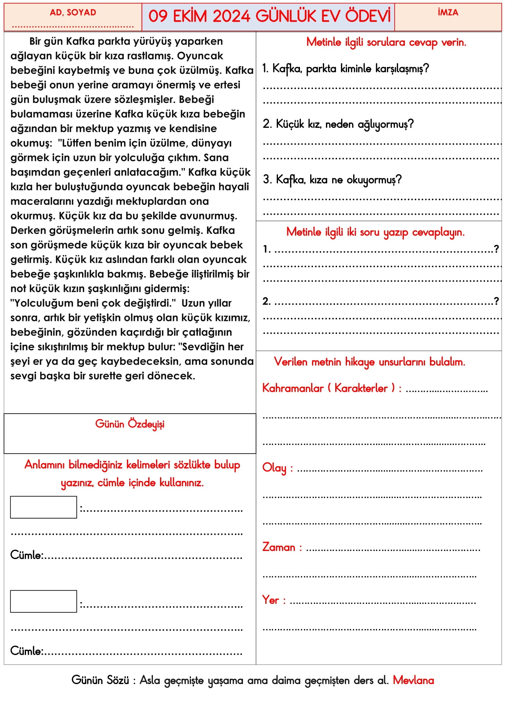 3. Sınıf 09 Ekim 2024 Günlük Ev Ödevi