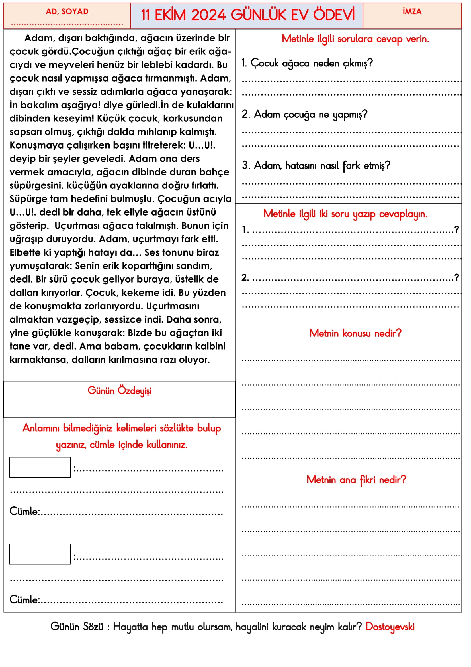 3. Sınıf 11 Ekim 2024 Günlük Ev Ödevi