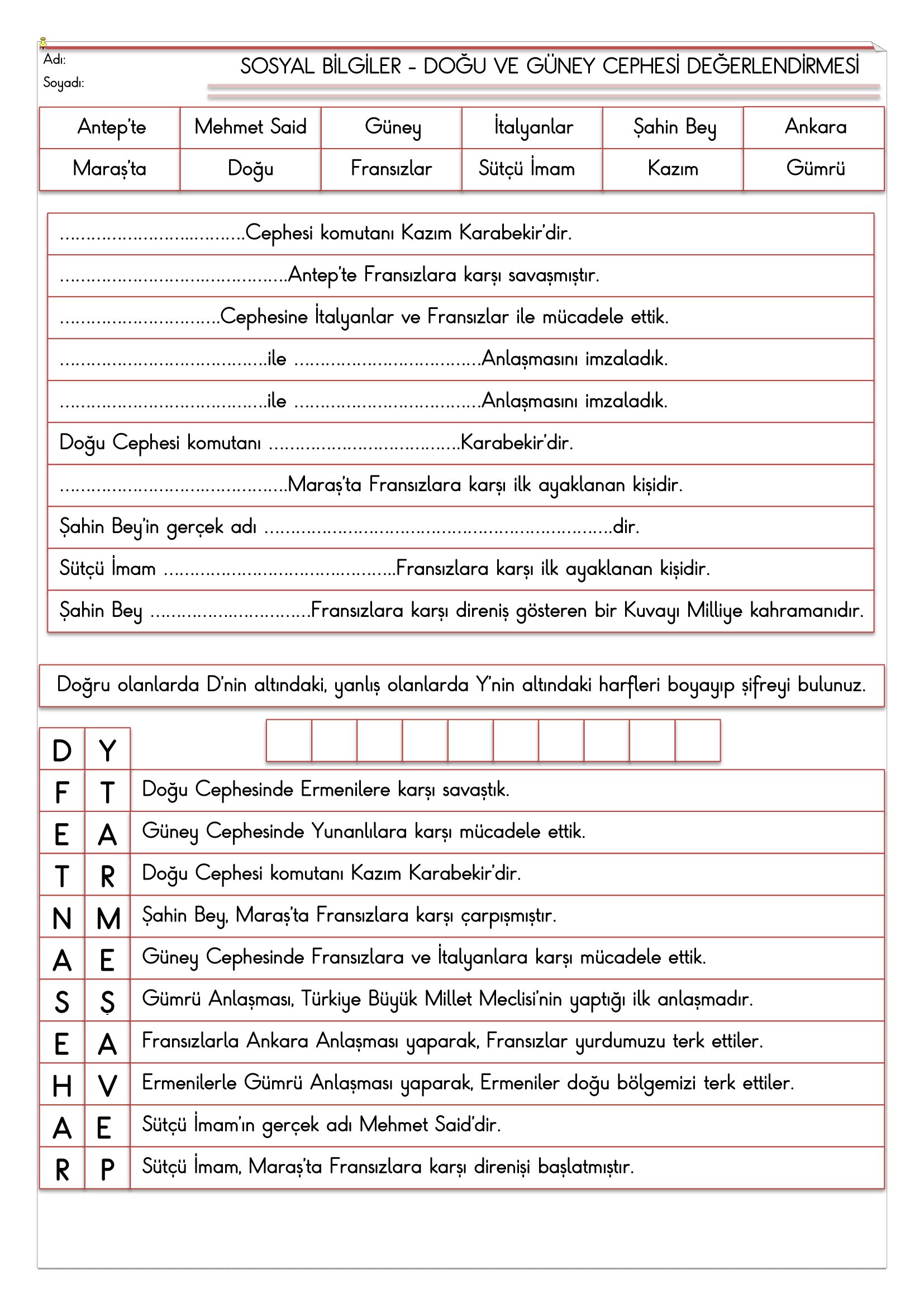 4.Sınıf - Sosyal Bilgiler Kurtuluş Destanı Değerlendirmesi-3