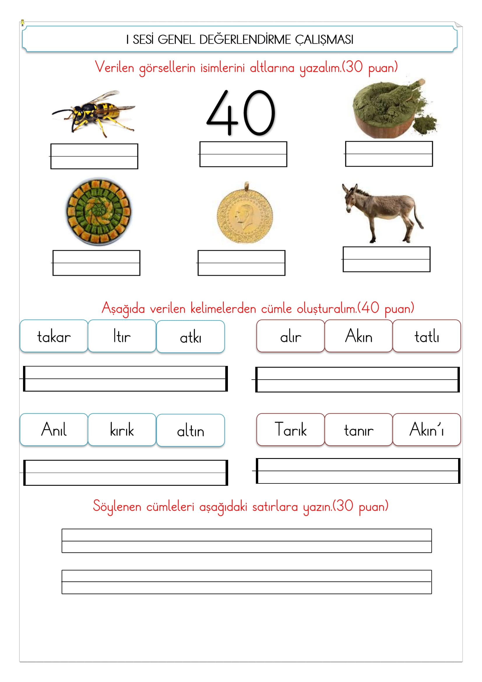 1.Sınıf İlk Okuma Yazma I Sesi Değerlendirme Çalışması