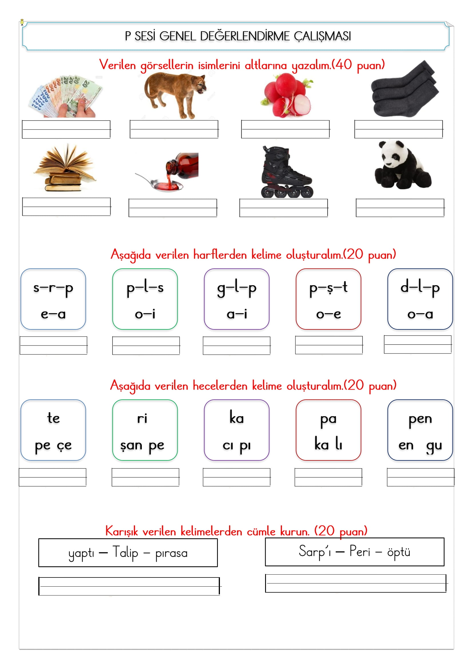 1.Sınıf İlk Okuma Yazma P Sesi Değerlendirme Çalışması 2
