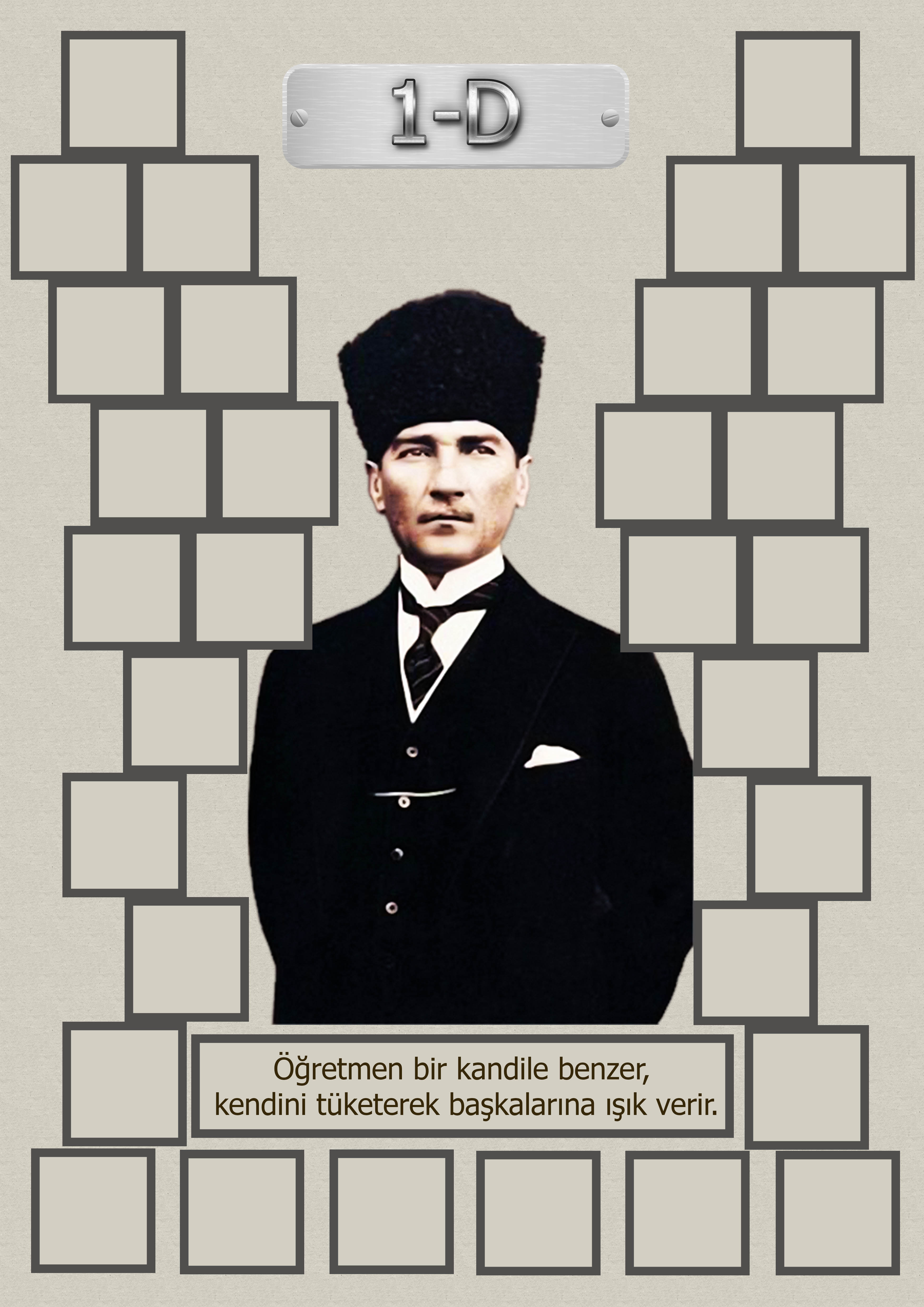 Model 15, 1D şubesi için Atatürk temalı, fotoğraf eklemeli kapı süslemesi - 32 öğrenciliktir. A3 boyutundaki yüksek çözünürlük afiş için dosyayı indiriniz. Kendi öğrenci sayınıza uygun bu model kapı süsü sitemizde yoksa ayrıca istek yapabilirsiniz.