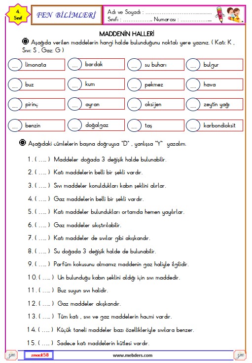 4. Sınıf Fen Bilimleri Maddenin Halleri Etkinliği