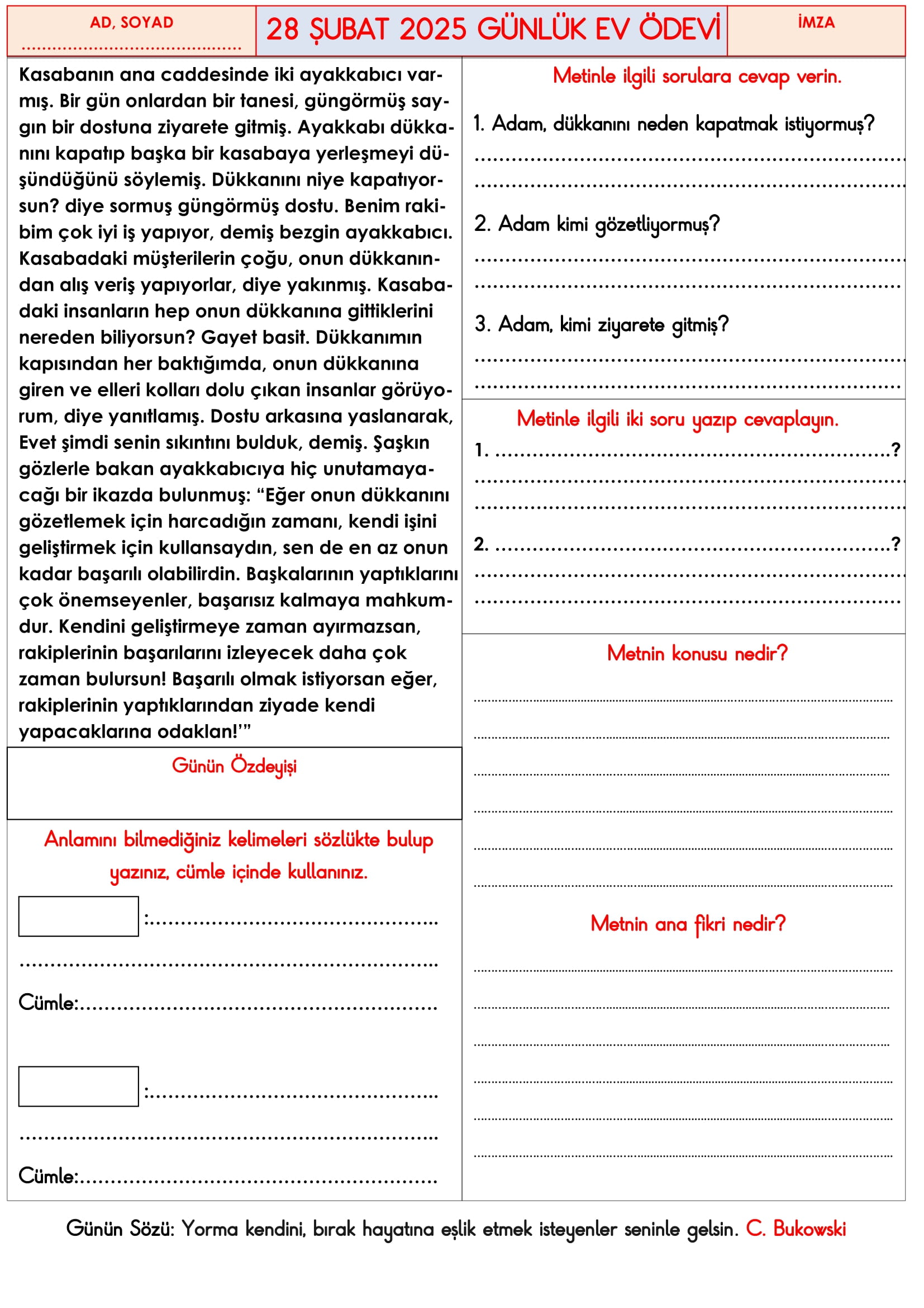 3.Sınıf 28 Şubat 2025 Günlük Ev Ödevi