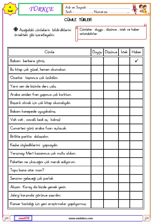 4.. Sınıf Türkçe Cümle Bilgisi Etkinliği 6