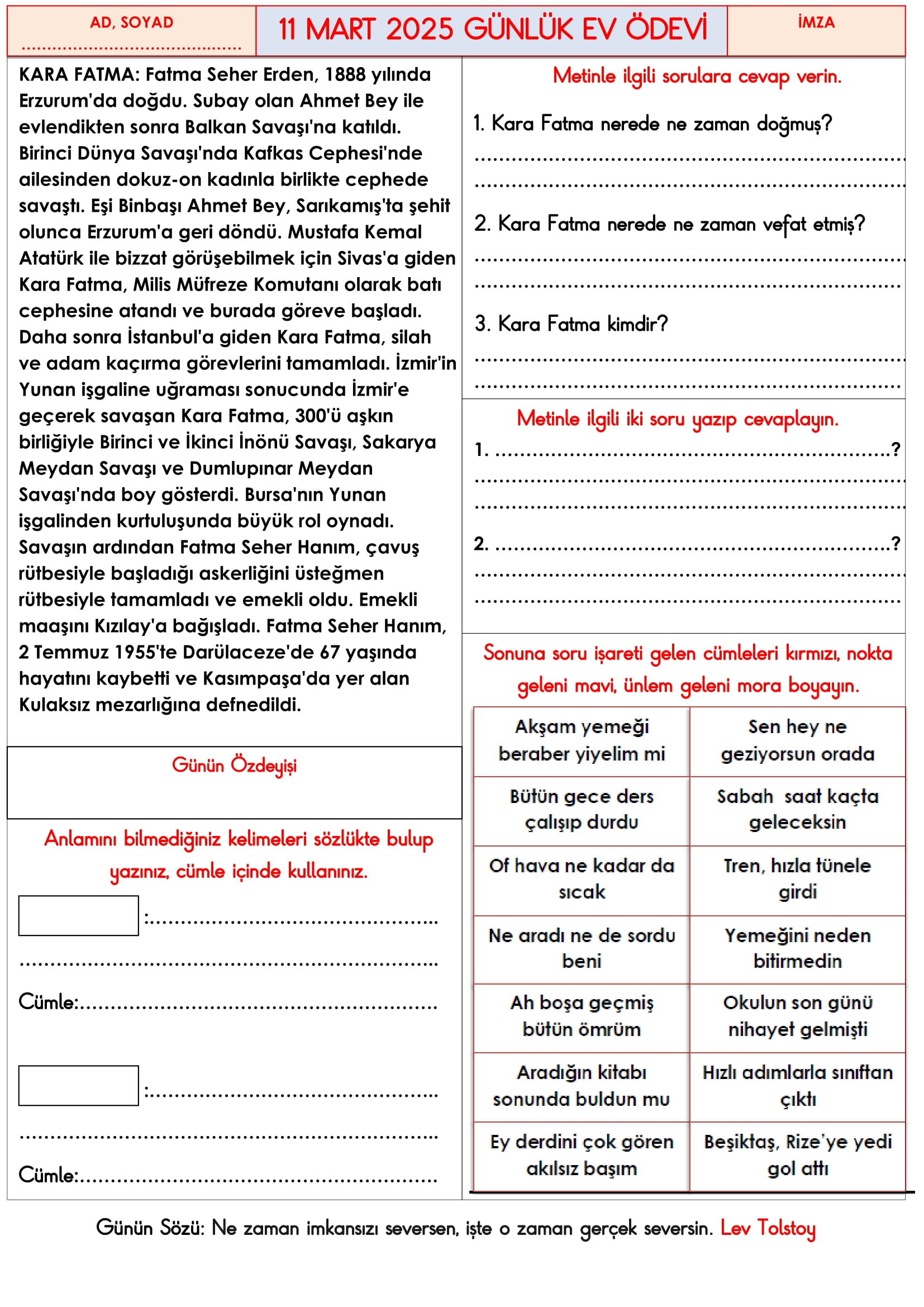 3.Sınıf 11 Mart 2025 Günlük Ev Ödevi