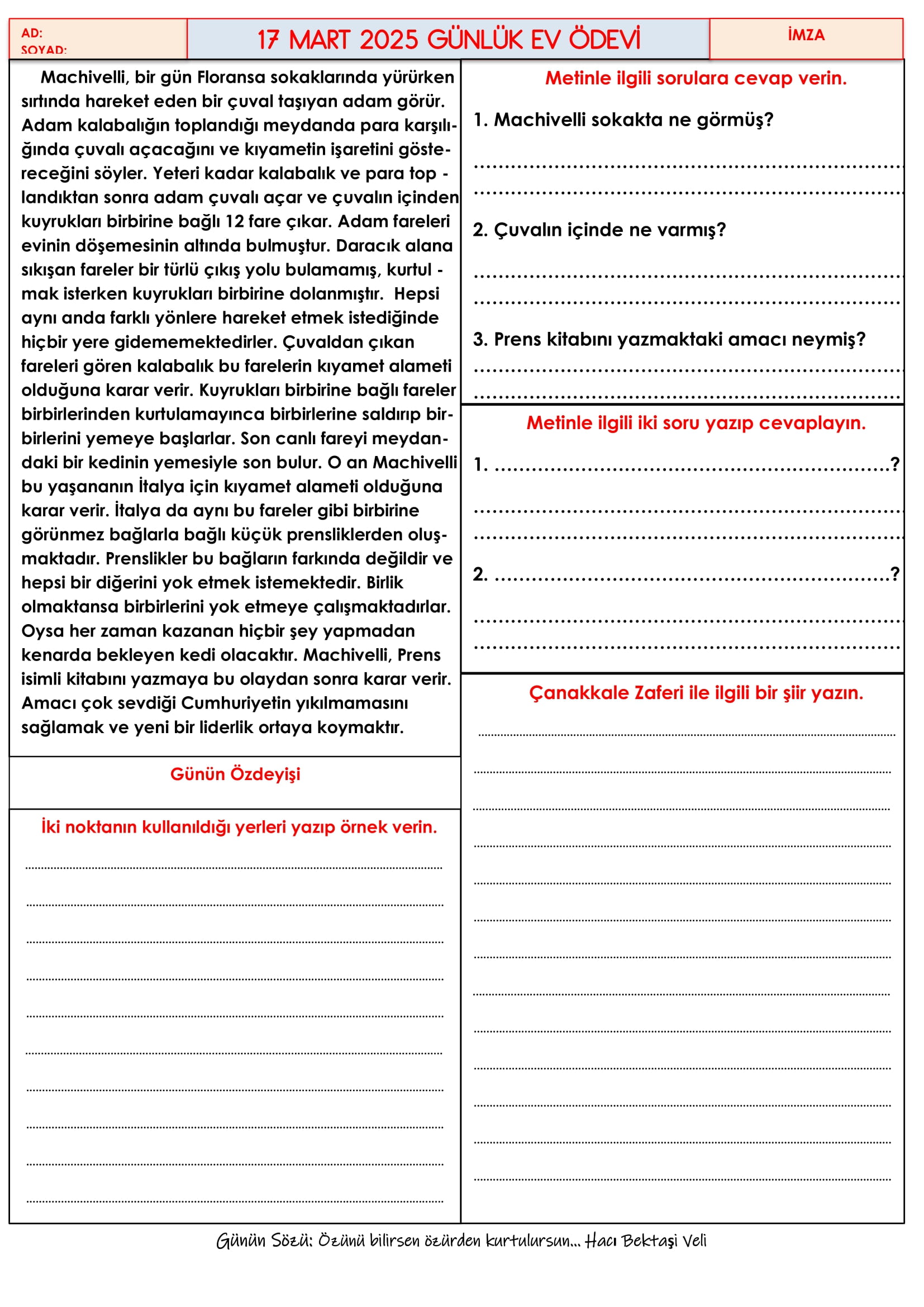 4.Sınıf 17 Mart 2025 Günlük Ev Ödevi