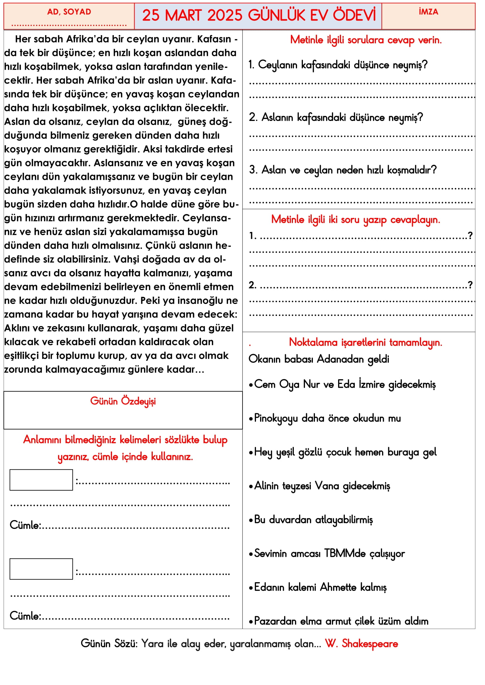 3.Sınıf 25 Mart 2025 Günlük Ev Ödevi